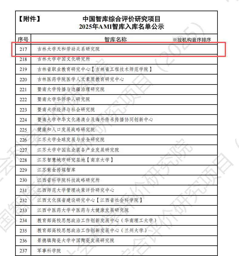 近日,中国社会科学评价研究院公布《中国智库综合评价研究项目2025年AMI智库入库名单》,吉林大学天和劳动关系研究院成功入选“中国智库综合评价研究项目(2025)AMI智库”。